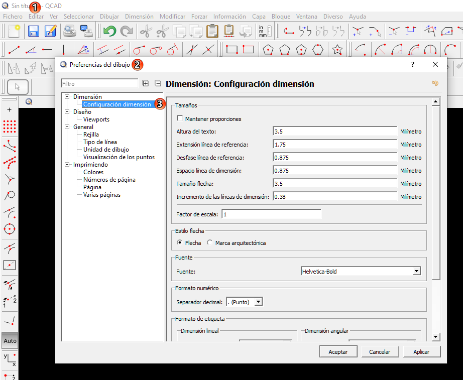 En la ventana “Editor de propiedades” aparece un tipo de cota, pero es lógicamente la que toco en el dibujo, pero ¿como puedo definir previamente que estilo quiero utilizar de las que tengo almacenadas? ¿No existe en QCAD algo parecido a un editor de estilo de acotación?