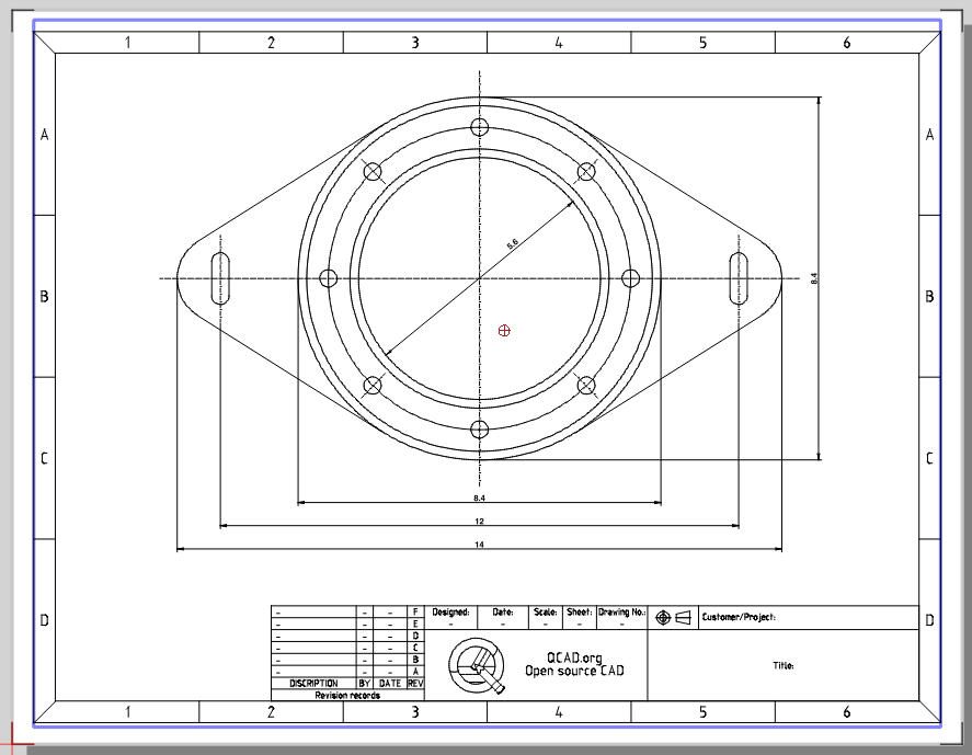 Please download this QCAD example flange and copy it 1:1 into the Model_Space of your new template: Test flange.dxf (112 KB)