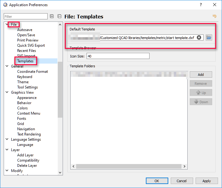 Now open the QCAD Application Preferences and tell QCAD where to find this template.