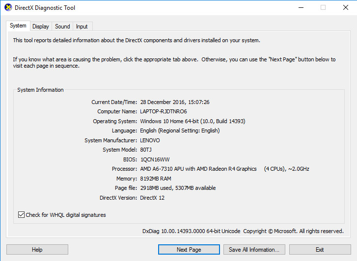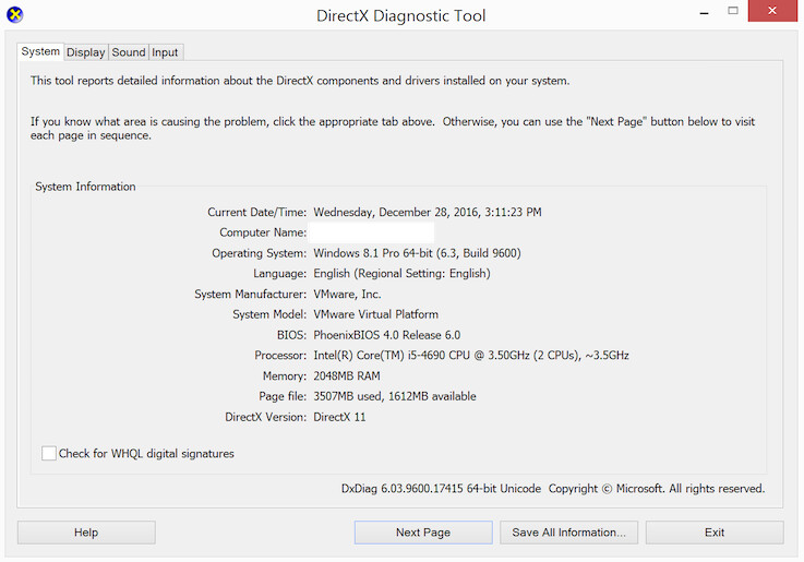 If you can run the dxdiag tool and post the dialog here, that might also be helpful. Here’s what mine looks like: