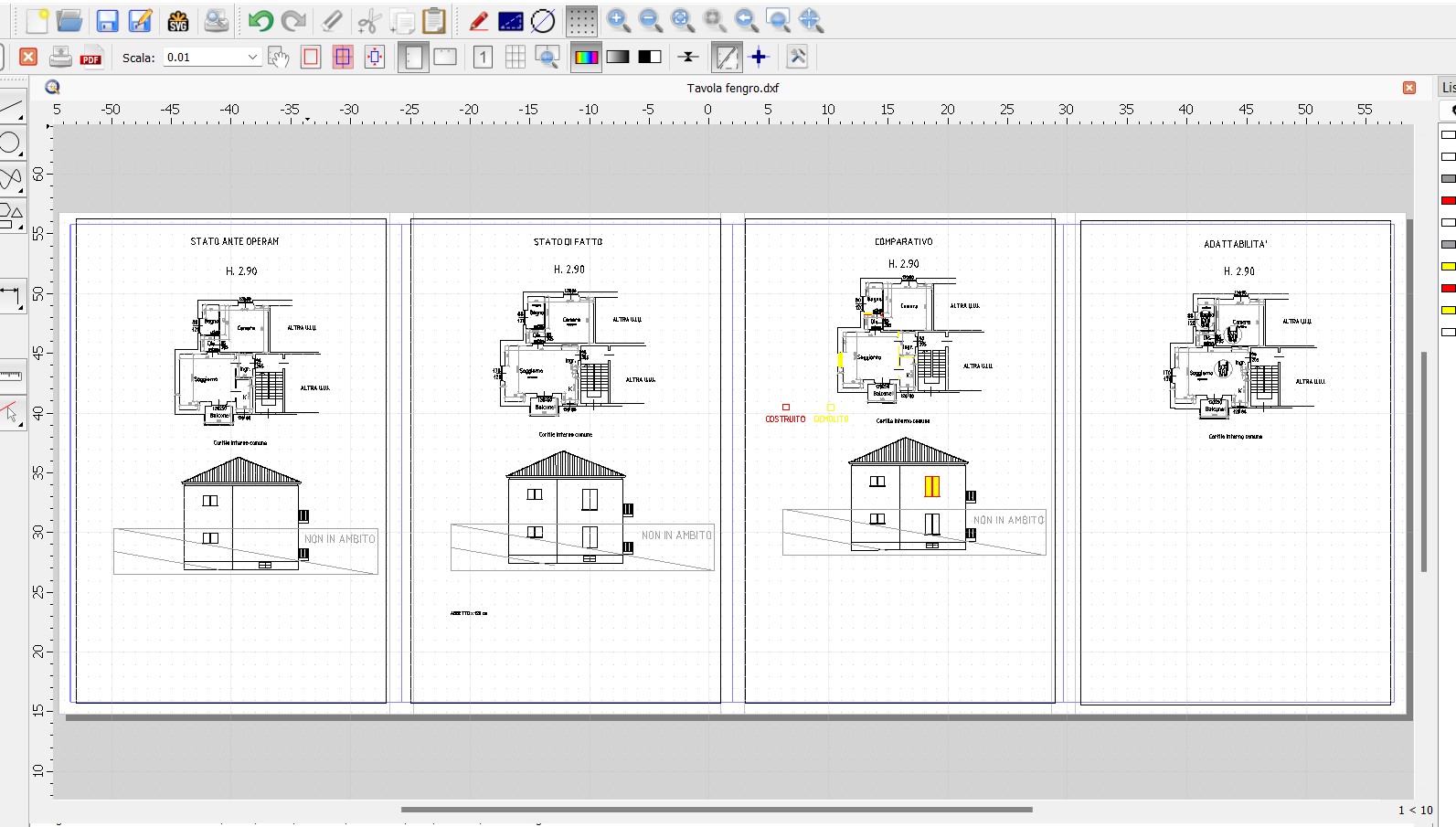 You might want to explore the use of 4 layouts with viewports: QCAD - Tutorial: Working with Layout Blocks and Viewports