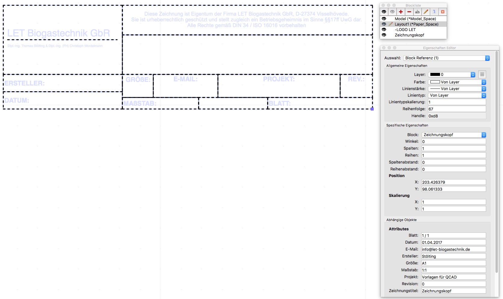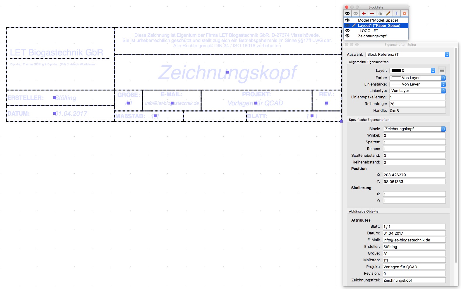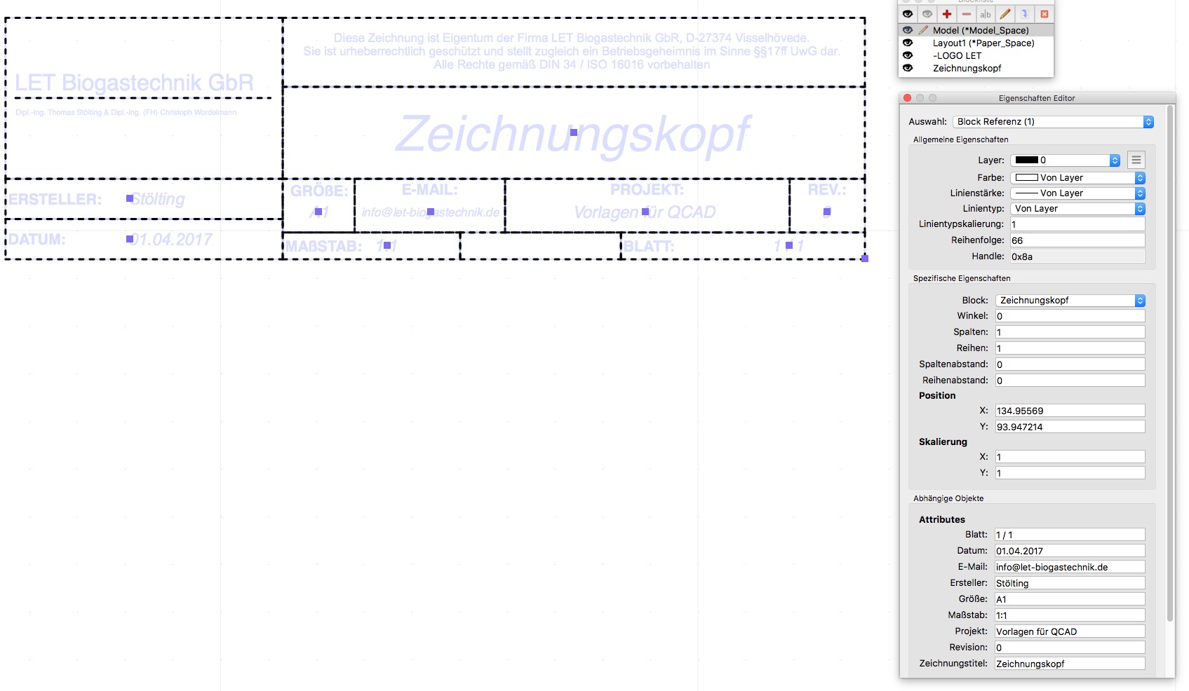 Der Zeichnungskopf kann stattdessen z.B. in einem Block “Zeichnungskopf” definiert werden. Der Block “Zeichnungskopf” wird dann in der Regel im Layoutblock eingefügt und die Attribute entsprechend definiert.