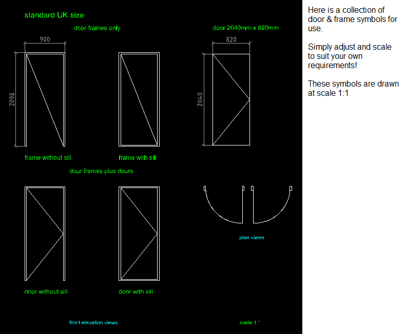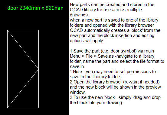 Please find attached some basic door and frame symbols including the original ‘re-drawn’ drawing which can be saved to the QCAD part library.I have taken and re-drawn these symbols/blocks from my old files.