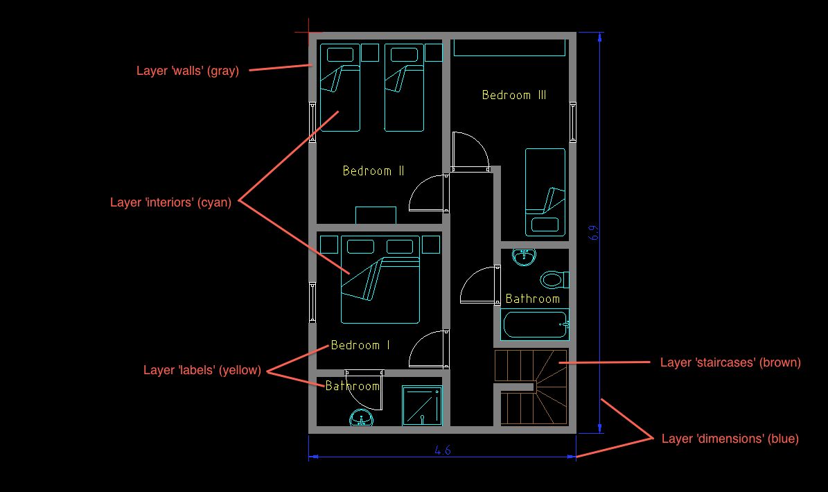 The reason behind all this it that entities with the same functionality are typically shown in the same color to make that functionality visible to the viewer of a drawing. This is a simple floor plan with a couple of examples for typical layer uses: