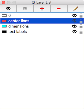 In this example, several layers with different colors and other attributes have been added. The current layer is red and called “center lines”. As long as this layer is active, all entities drawn will be red. If the color of the layer is later at any point changed, all entities on that layer will also change their color.