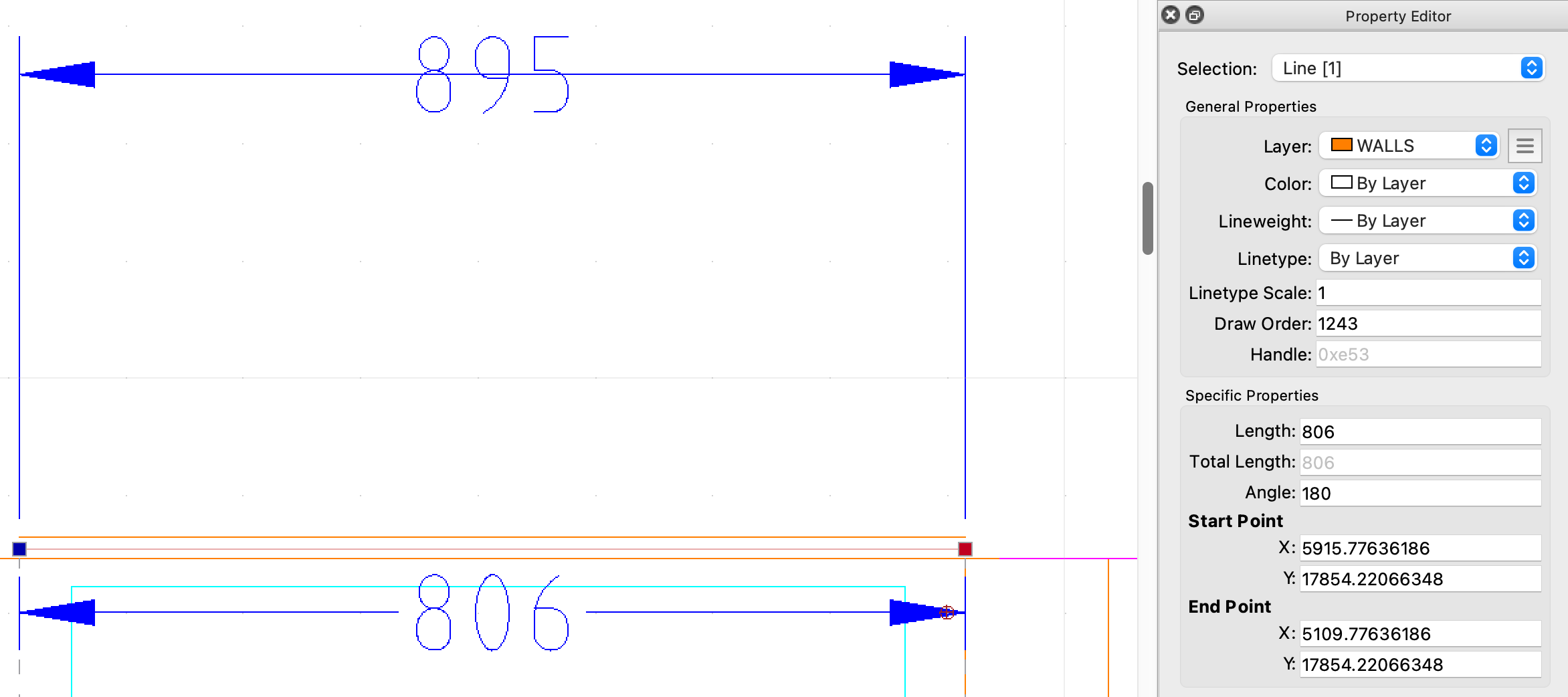This screenshot shows one of the lines with the Length Property of 806, consistent with the Dimensions. The line above the selected line has a Length property of 895, this despite the fact that it is drawn perpendicular to the same parallel lines the the select line is drawn between.