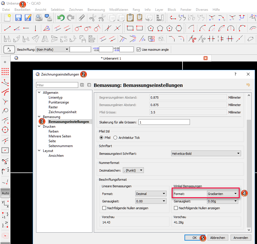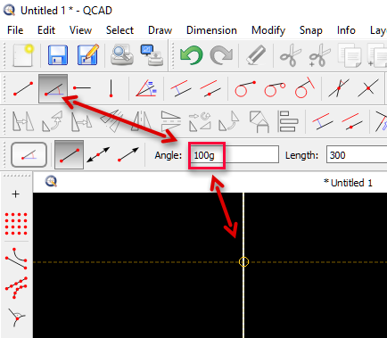 QCAD kann leider nicht mit Gon umgehen. Gon (Vollkreis= 400°) muss also in Grad (Vollkreis= 360°) umgerechnet werden. Das Gute ist, dass in den Feldern für Winkeleingaben auch gerechnet werden kann. So liefert z.B. die Eingabe “100/1,11111” das Ergebnis 90.