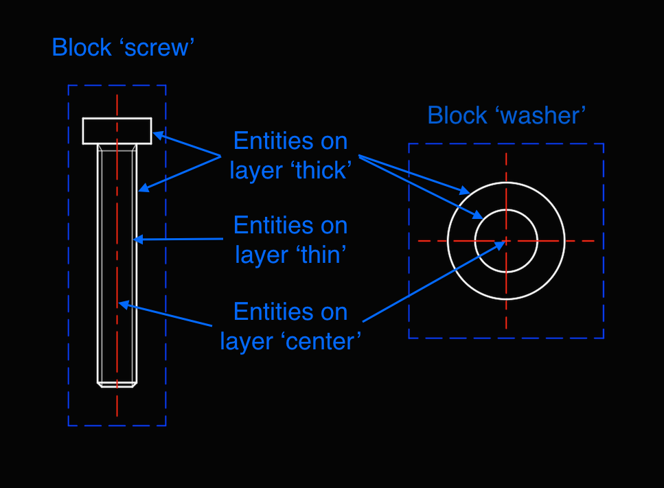 Blocks (in the context of CAD) are reusable groups with a name. A block might for example represent a piece of furniture in a floor plan or a screw, bolt or washer in a mechanical drawing.