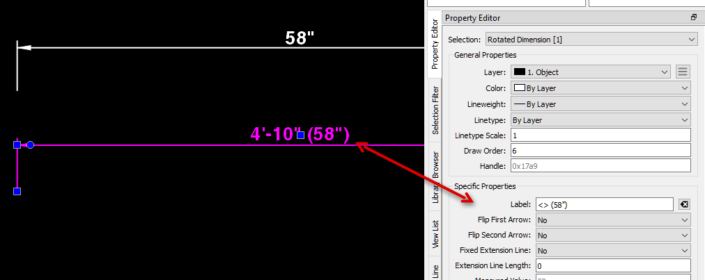If you select a dim you are then able to manipulate the label within the Property Editor. If you type in 58" it will replace the measured value of 4’ 10". This text is then static what means it will not change in the case that you manipulate the dim.