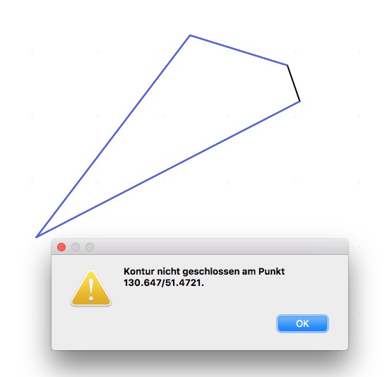 Zwar lassen sich jetzt auch nach einer Fehlermeldung weitere Elemente hinzufügen ohne dass alles neu ausgewählt werden muss, aber die Anzeige der Punkte, die nicht “geschlossen” sind, ist seltsam. Es werden, selbst wenn offenkundig nur an 2 Stellen eine Auswahl nicht geschlossen ist, x verschiedene Koordinaten nacheinander in separaten Fenstern angezeigt, die jedesmal mit OK bestätigt werden müssen.