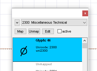 Once placed, I can select the symbol in the ‘Label’ section of the Property Editor, and replace it with the correct Unicode symbol (Unicode 2300) and it displays correctly. (The lower dimension example in this screenshot)