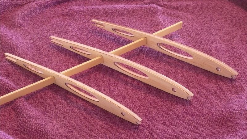 Here’s an attached photo of a three rib section for Monocote testing. Since the leading edge is pulled back 35 deg, each rib has to have the outward balsa pulled back by a certain amount based on an angle of 35 deg and foam thickness of 4mm. The balsa pieces are the chord design length but the foam has to be 2.8mm longer. At assembly, the inward balsa is aligned with the front of the foam and the outward balsa aligned with the back of the foam. The foam outline is stretched in the x-axis in QCAD relative to it’s center point, the spar. After gluing, water based polyurethane varnish, the excess foam at the nose and tail is trimmed with an Xacto knife while the remainder is removed with 100 grit paper on a sanding block. The V shaped notch on the front will be filled with a 1/2 in. piece of square balsa rotated 55 deg from square. This gives the minimum amount of sanding to achieve the airfoil shape. The slots at the back will be filled with a piece of 1/8 in. x 3/4 in. piece of balsa. A piece of tapered 3/8 in. x 2 in. balsa, aileron stock, will be the trailing edge. The ailerons will use the same material with hinges. The slots for the hinges will be cut into the 1/8 in. x 3/4 in. edge using a precision miniature table saw with a thin blade. The servo will be mounted on additional balsa blocks between two of the appropriate ribs.