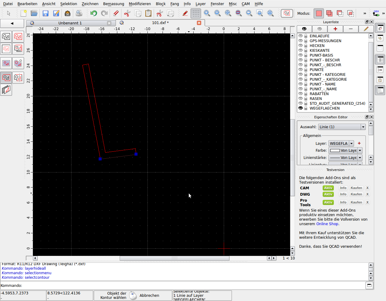 I found the command “select contour” wich does not seem to work for me. Even though two lines (on the same layer) share the same coordinates for one point only one line gets selected. I attached a file in my first post where I experience this problem. For example turn of all layer but the one called “WEGEFLAECHEN”. There is one closed contour that does not get selected. This does not work for any of my contours. Is there something wrong with me or my file!?
