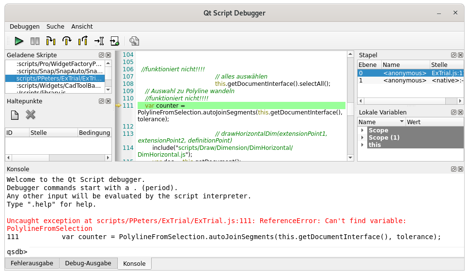 But none of this will work. I put the code to my script and got in both case the error (running qcad in debug mode): “Uncaught exception at scripts/PPeters/ExTrial/ExTrial.js:111: ReferenceError: Can’t find variable: PolylineFromSelection”