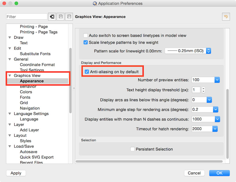 Edit > Application Preferences > Graphics View > Appearance > Antialiasing on by default: