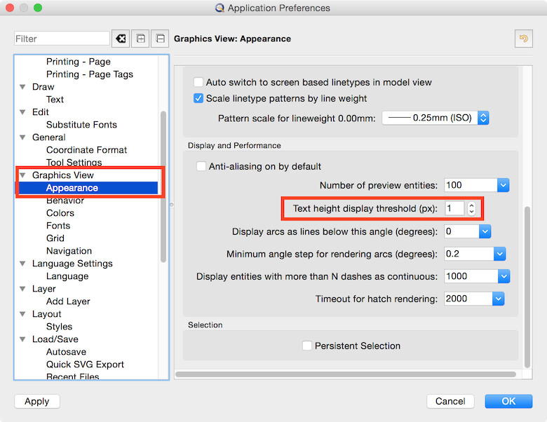 Edit > Application Preferences > Graphics View > Appearance > Text height display threshold (px):