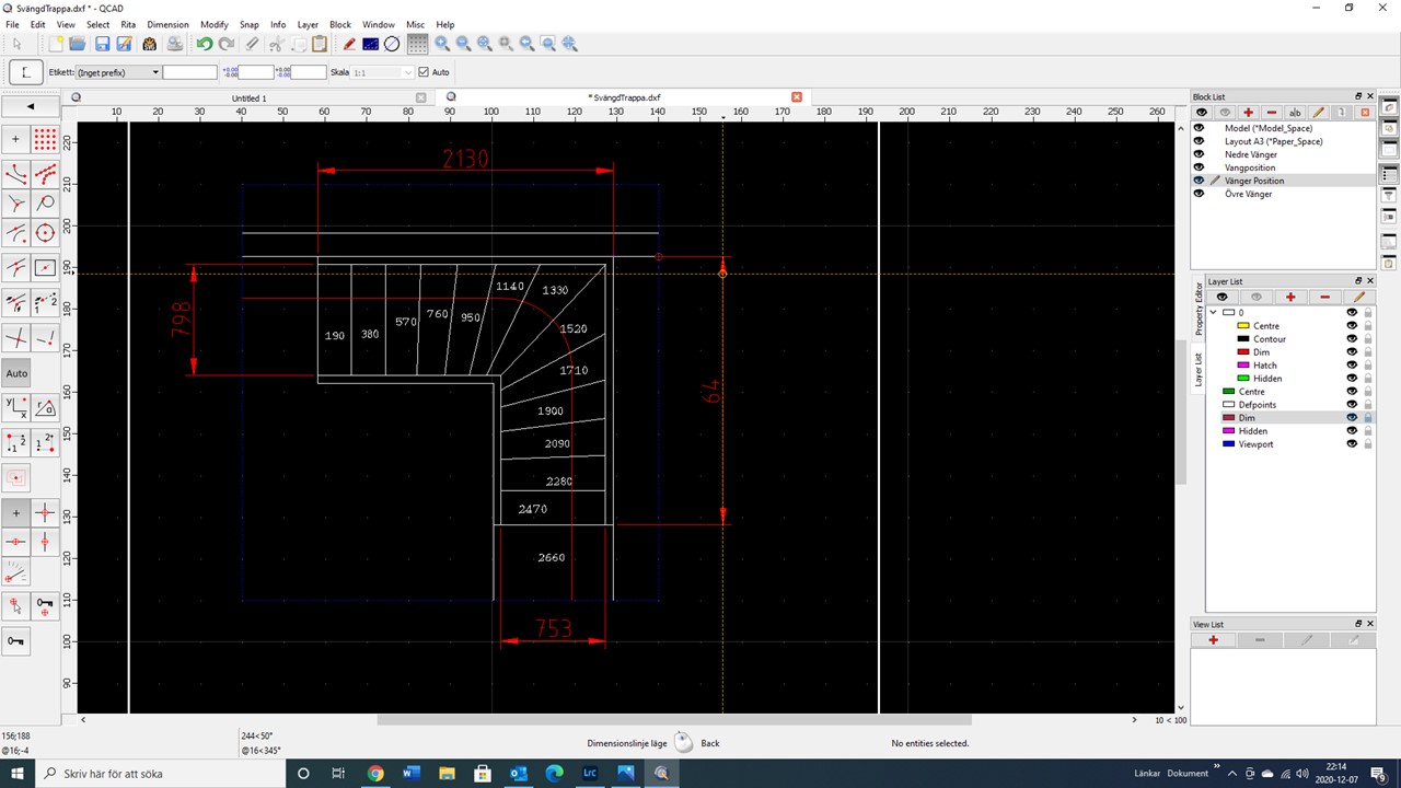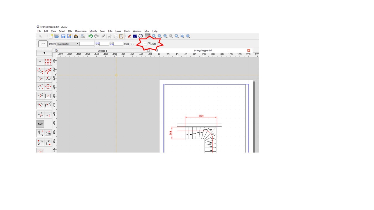 Thanks a lot for the help! I am trying to convert myslef from AutoCAD to QCAD and most things are fine, but scaling and dimensions have been hard for me to get a grip of. The mix in the attached drawing is just because that is the drawing I am doing right now and I had started to do the dimensions in model space, but I am now changing to paper space. I am building the stair at the same time, so I am jumping back and fourth between the workshop and the drawing…