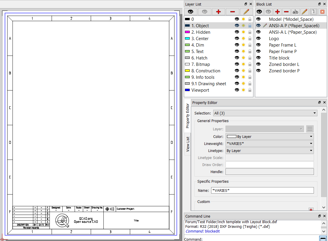 Reusable block: Sure. You could use the QCAD Library to use one and the same block in multiple drawings. A copy and paste action would accomplish this task too - just another way to do it.