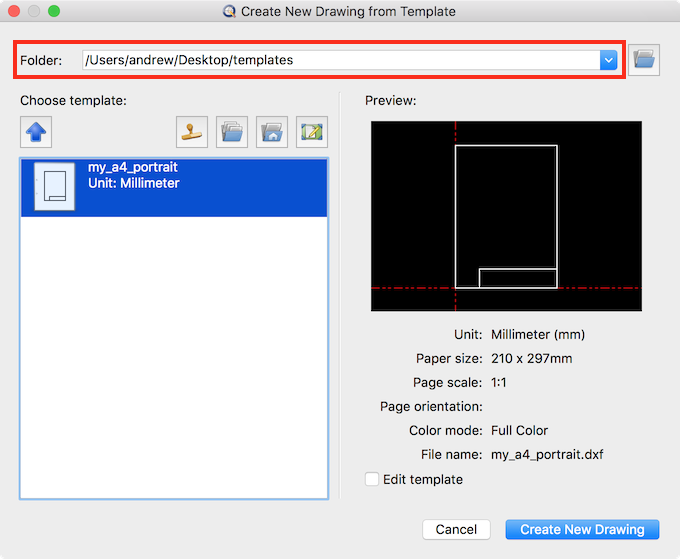 Your templates are now ready for use. If you create a new drawing from a template using File > New from Template, you can choose your configured folder at the top, browse your templates and create new drawings from them.
