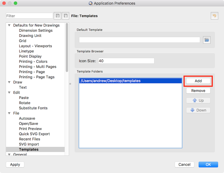 - Add that folder to the templates folders of QCAD under Edit > Application Preferences > File > Templates > Template Folders